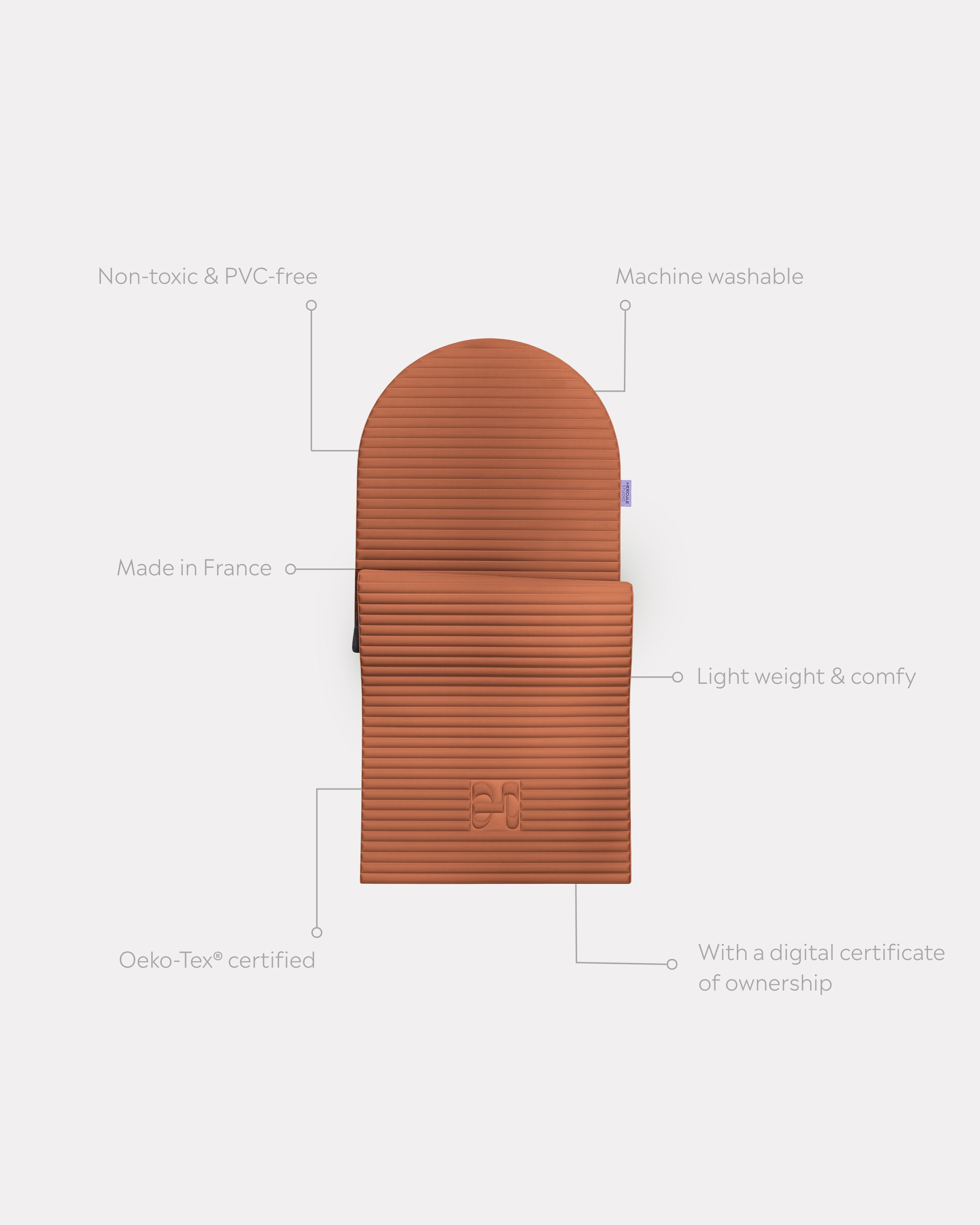 Its cushioning surface provides comfort and sensoriality, and its 0.8 cm thickness guarantees a firm yet welcoming fit. Its Terracotta color is inspired by the Esterel red tones, evocative of the charm of the French Riviera, found in the red rocks of Théoule-sur-Mer and on Pierre Cardin's iconic Palais Bulles.