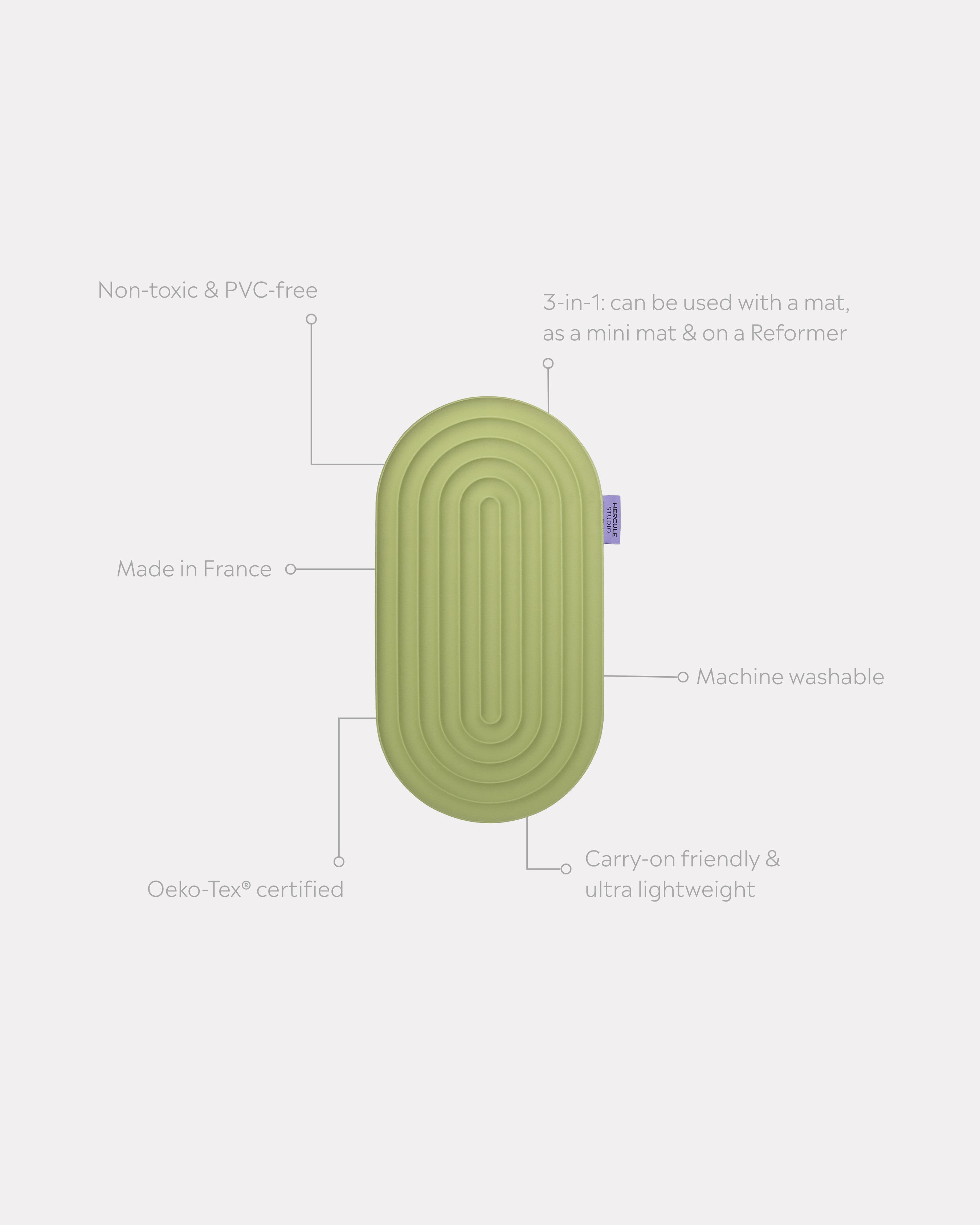 Mini tapis de sol pad de confort de la marque hercule studio modèle galé couleur pistache packshot déplié avec éléments de réassurance