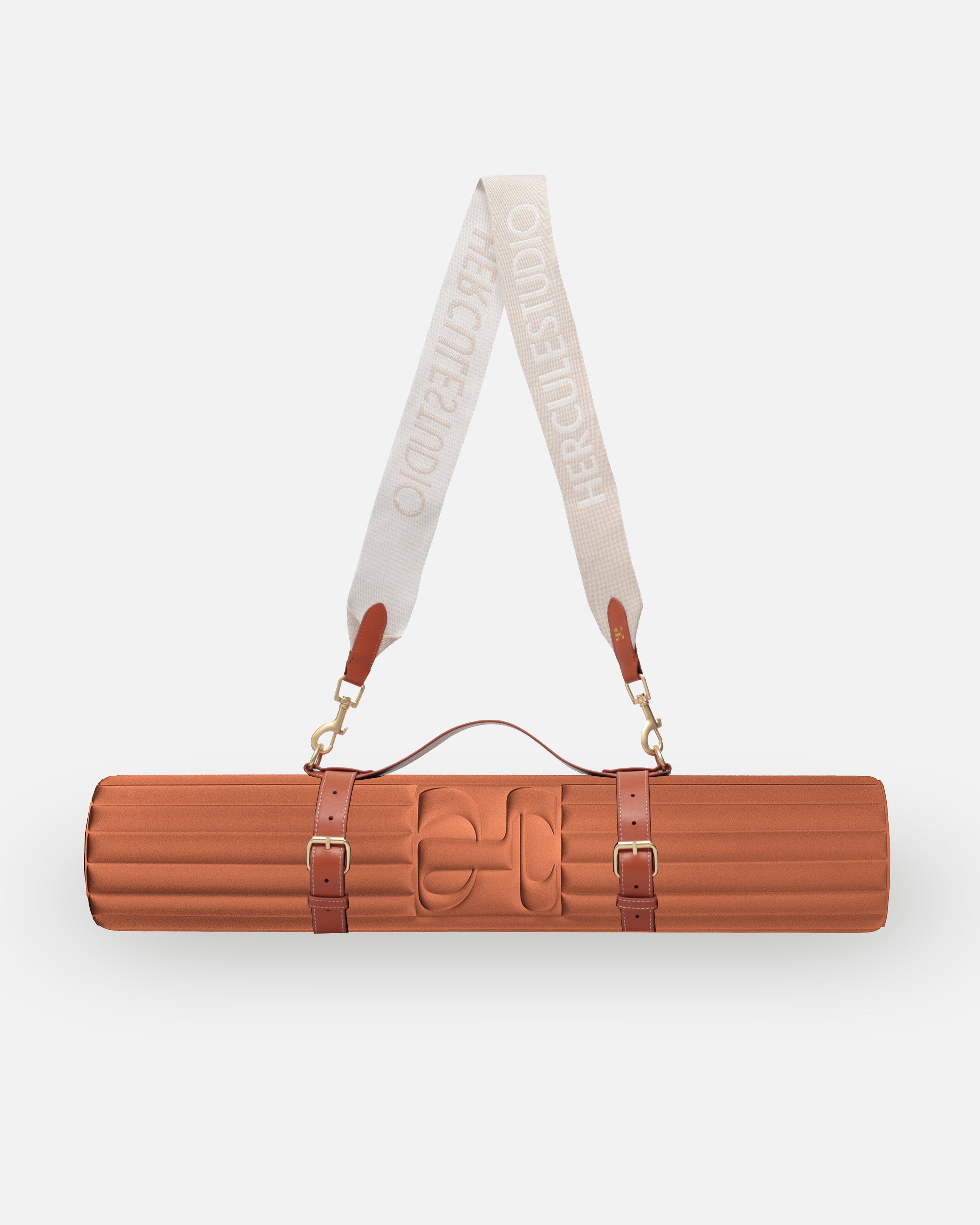 Tapis de sport couleur terre cuite de la marque Hercule Studio avec sangle de stransport Soca en cuir végétal packshot fond blanc