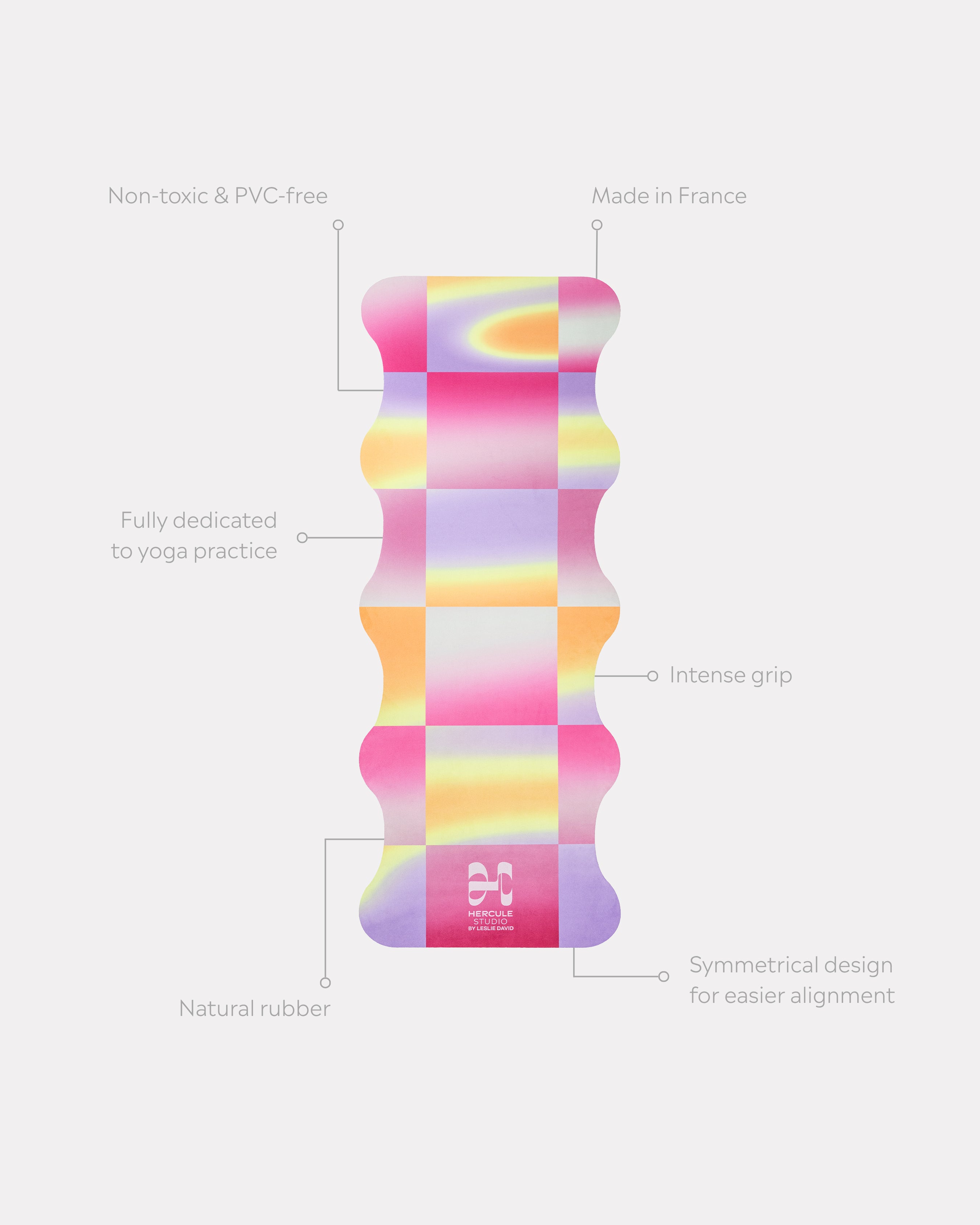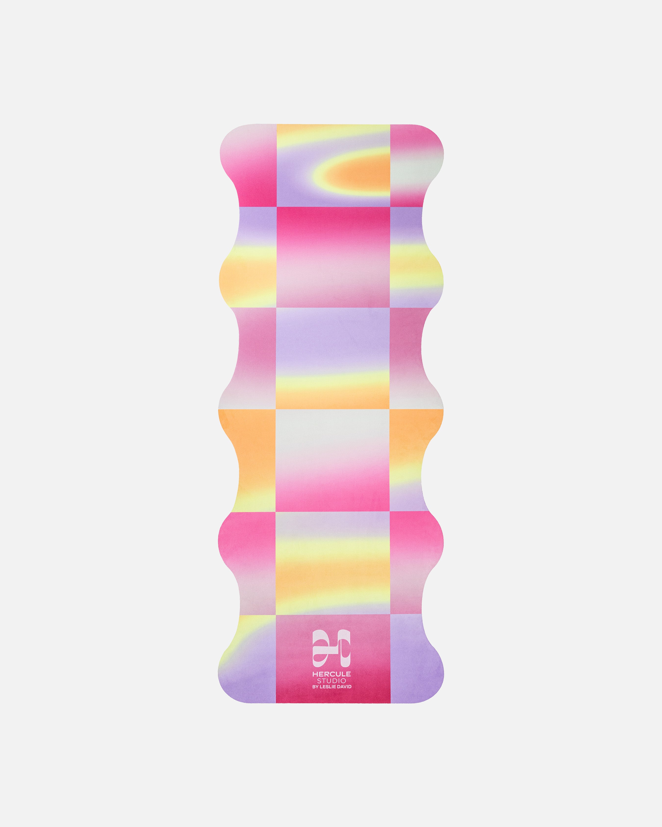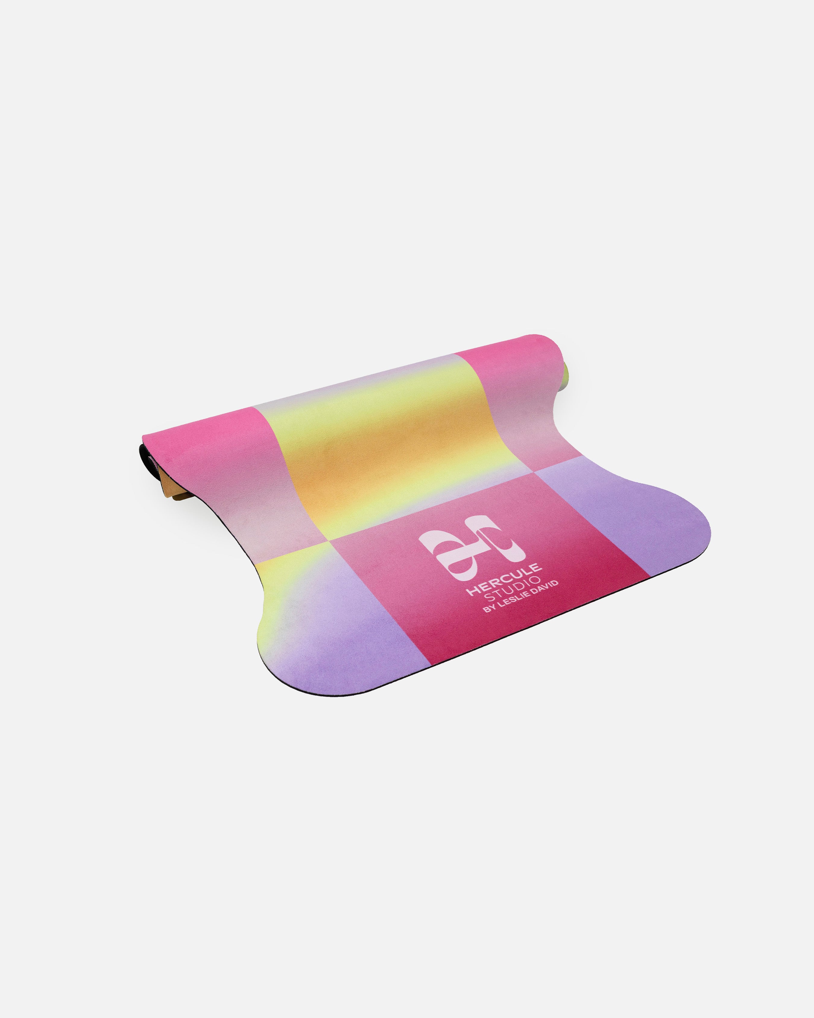 Tapis de yoga Mar de la marque Hercule Studio en collaboration avec Leslie David Studio en matière suède, couleur rose, orange et jaune Dance Out