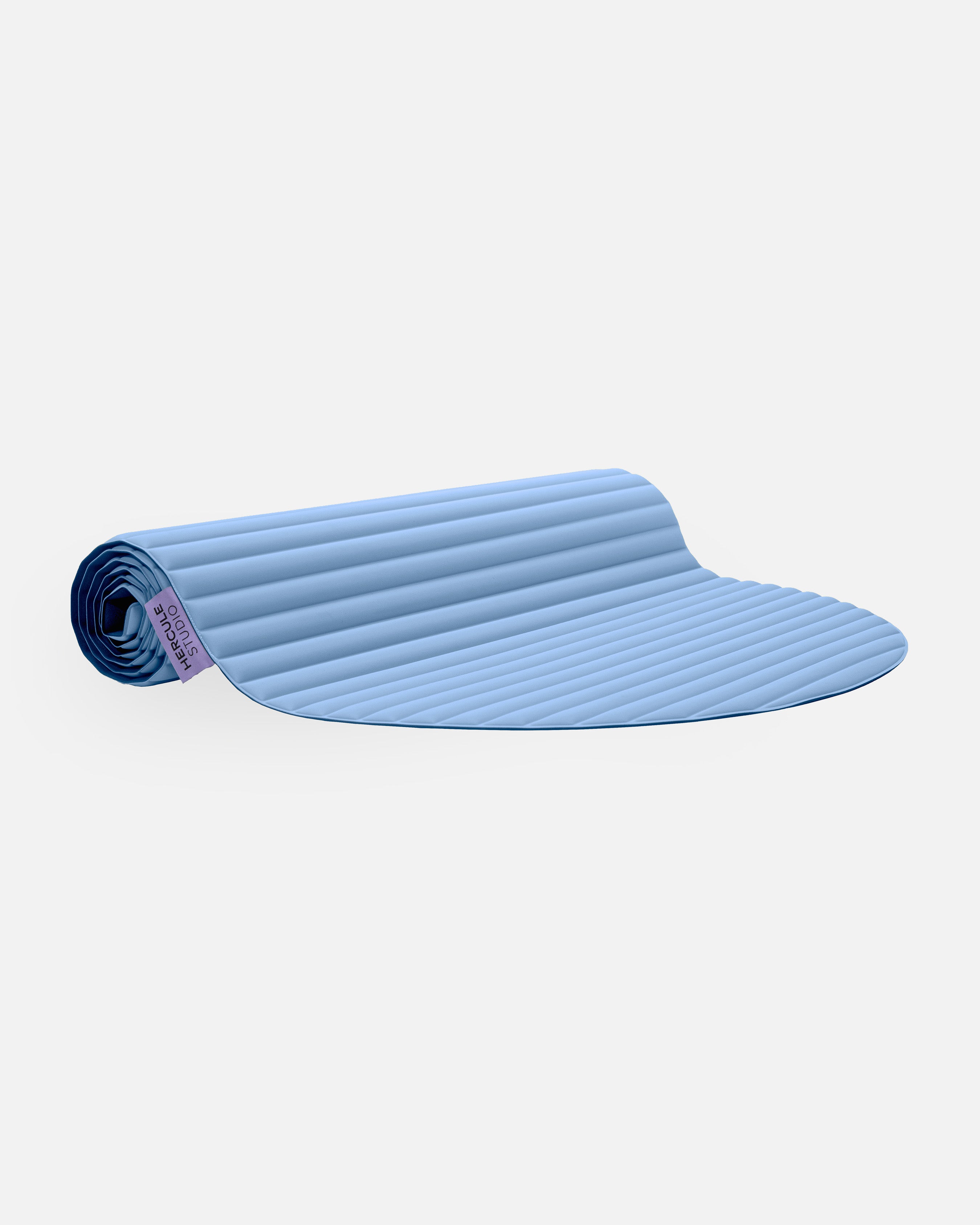 Sa surface au relief bombé apporte confort, sensorialité et son épaisseur de 0,8 cm garantit un maintien ferme et accueillant à la fois. Sa couleur, Blue-jean, s’inspire de la mode et d’un vestiaire urbain iconique, universel et intemporel. Le bleu est également une couleur phare de la Méditerranée, associée à la mer, au ciel, au vent, aux espaces indéterminés, à l’horizon et à la transparence. Le bleu épouse les courbes et les reliefs du Tapis de sport Archy pour le rendre accueillant, apaisant et doux. Sa sous-teinte grise lui procure un côté neutre mais incisif, intemporel mais futuriste, tendance et résolument contemporain.